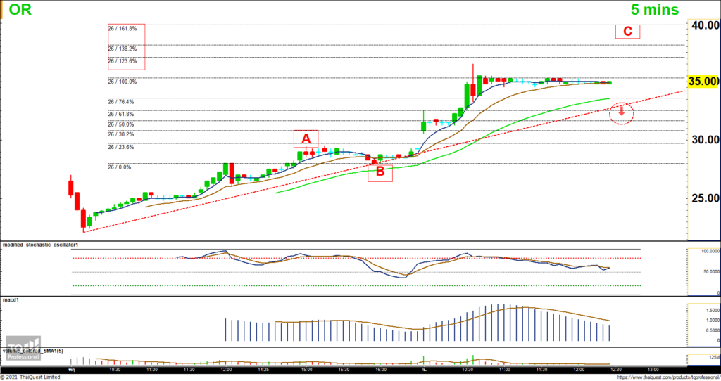 มาถึงการวิเคราะห์กราฟราคาหุ้นด้วยปัจจัยทางเทคนิค ซึ่งผมจะใช้ทฤษฎี Elliott wave มาคาดการณ์แนวโน้มราคาหุ้น โดยตั้งสมมติฐานว่า หุ้น OR ปรับขึ้นในรูปแบบโครงสร้างคลื่น ABC ตามรูปที่แสดง ดังนั้น เป้าหมายของราคาหุ้น OR ตามทฤษฎี Elliott wave ก็คือ เป้าหมายของคลื่น C ซึ่งตามทฤษฎีมักยาวประมาณ 100-161.8% เมื่อเทียบกับความยาวคลื่น A