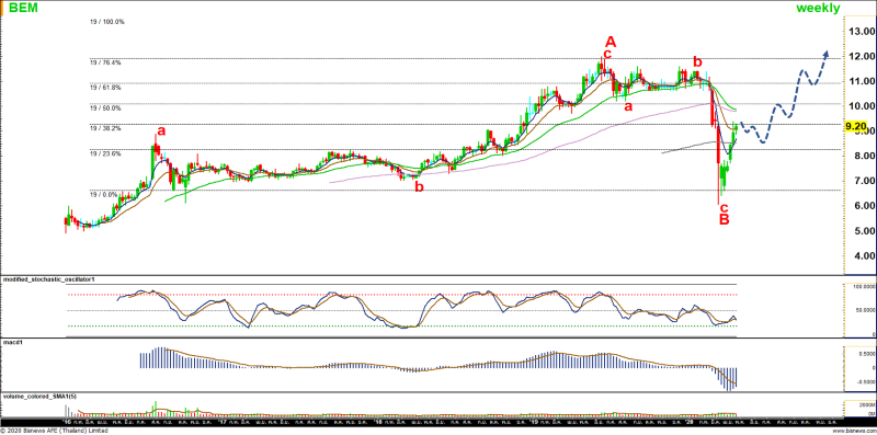 BEM : ในภาพรวมฟอร์มตัวขึ้นเป็นโครงสร้างคลื่น ABC ใหญ่ โดยปัจจุบันพักตัวลงมาเป็นคลื่น B และมีโอกาสเริ่มขึ้นทำคลื่น C ใหญ่ แต่ก่อนหน้านั้นจะอ่อนตัวลงมาก่อน ซึ่งมองว่าบริเวณแนวรับ 7.00-8.00 บาท จะเป็นจุดรองรับได้ เพื่อกลับมาปรับตัวขึ้น โดยเบื้องต้นมีเป้าหมายบริเวณจุดสูงเดิมที่ 11.00-12.00 บาท