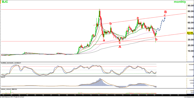 BJC : ภาพรวมเคลื่อนไหว Sideways ในกรอบใหญ่ ในโครงสร้างคลื่น ABC โดยปัจจุบันกำลังฟอร์มขึ้นเป็นขา c ของคลื่น B ใหญ่ (ไม่ควรต่ำกว่า 25 บาทแล้ว) โดยมีเป้าหมายขึ้นมาที่บริเวณ 70-80 บาท อย่างไรก็ตาม หลังจากนั้นมีโอกาสปรับลงมาหากรอบล่างอีกครั้งในระยะยาว บริเวณ 30-40 บาท