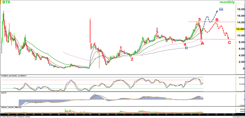 BTS : ติดตามจุดสูงเดิมบริเวณ 14.40 บาท หากขึ้นทะลุผ่านได้ การไต่ระดับจะเกิดขึ้นได้ต่อ หรือทำคลื่น 3 ใหญ่ (นับแบบสีน้ำเงิน) ส่วนกรณีไม่ผ่าน ภาพรวมยังเป็นการพักฐานชุดใหญ่ ABC ในชุด Corrective wave (นับแบบสีแดง) หลังจากนั้นให้ระวังการปรับลงมาทำคลื่น C  หากรอบล่างบริเวณ 8.00-9.00 บาท อีกครั้ง