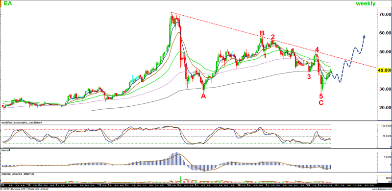 EA : ลงครบคลื่น ABC โดยการฟื้นตัวมีแนวต้านสำคัญอยู่ที่ 47.50 บาท ซึ่งหากขึ้นทะลุผ่าน จะแสดงสัญญาณยืนยันว่าในภาพรวมลงครบคลื่น ABC ใหญ่ และเข้าสู่รอบการปรับตัวขึ้น โดยมีแนวต้านถัดไปที่ 54.50 และ 61.00 บาท ตามลำดับ ทั้งนี้ การหลุดต่ำกว่า 29.00 บาท จะเป็นสัญญาณลบในภาพรวม