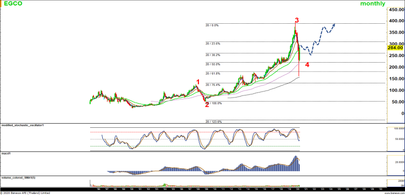 EGCO : ลงมาเจอแนวรับของคลื่น 4 ใหญ่แล้ว บริเวณ 200 บาท เพื่อฟอร์มตัวขึ้นเป็นคลื่น 5 ใหญ่ต่อไป (ไม่ควรต่ำกว่า 200 บาท แล้ว) โดยมีเป้าหมายเบื้องต้นบริเวณจุดสูง 350-400 บาท