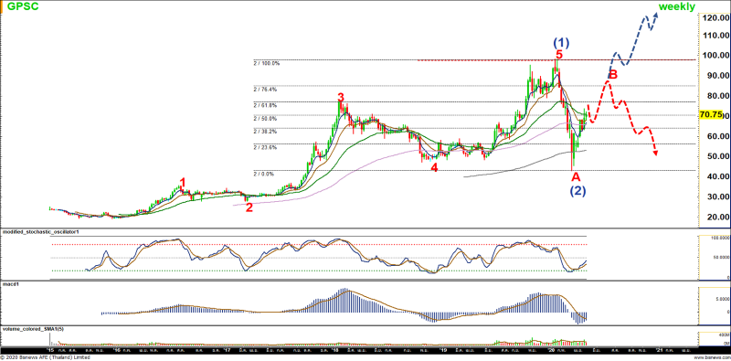GPSC : ขึ้นมาครบ 5 คลื่น แล้วพักตัว โดยหากระยะถัดไปทำคลื่น ABC จะทำให้การปรับขึ้นไม่ผ่านจุดสูงเดิม โดยมีแนวต้านที่ 80-100 บาท ตามลำดับ และจะปรับลงมาอีกครั้ง อย่างไรก็ตาม หากขึ้นทะลุ 100 บาท ได้ จะแสดงว่าที่ขึ้นมาครบ 5 คลื่น ก่อนหน้านี้ เป็นเพียงคลื่น (1) ใหญ่ และพักตัวเป็นคลื่น (2) ใหญ่ และจะปรับขึ้นยาวเป็นคลื่น (3) ใหญ่ เป็นลำดับถัดไป