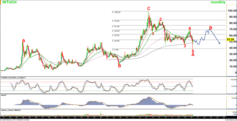 INTUCH : ในภาพรวมเคลื่อนไหวรูปแบบ Corrective wave ทั้งขาขึ้นและลง โดยขาขึ้น ABC รอบที่แล้วจบไปแล้ว และกำลังอยู่ในขาลง ABC โดยปัจจุบันกำลังฟื้นขึ้นเป็นคลื่น B โดยมีแนวเป้าหมายที่ 76.50 และ 85.50 บาท ซึ่งคาดจะถูกจำกัด หลังจากนั้นระยะถัดไป จะปรับลงทำคลื่น C อีกครั้ง