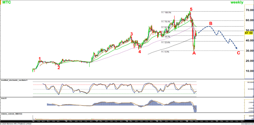 MTC : ปรับลงเป็นคลื่น ABC หลังปรับขึ้นมาครบ 5 คลื่นใหญ่ก่อนหน้านี้ โดยปัจจุบัน คาดว่าคลื่น A จบแล้ว และรอปรับขึ้นเป็นคลื่น B โดยมีเป้าMTC : ปรับลงเป็นคลื่น ABC หลังปรับขึ้นมาครบ 5 คลื่นใหญ่ก่อนหน้านี้ โดยปัจจุบัน คาดว่าคลื่น A จบแล้ว และรอปรับขึ้นเป็นคลื่น B โดยมีเป้าหมายที่ 60.00 และ 69.25 บาท หลังจากนั้นจะลงทำคลื่น C โดยมีเป้าหมายเบื้องต้นที่ 30.00 บาท ทั้งนี้ หากกรณีขึ้นทะลุผ่านจุดสูงเดิมที่ 69.25 บาท ภาพรวมจะกลับมาเป็นบวก หรือเกิดคลื่น Impulse ชุดใหม่ เพื่อไต่ระดับขึ้นต่อไป
