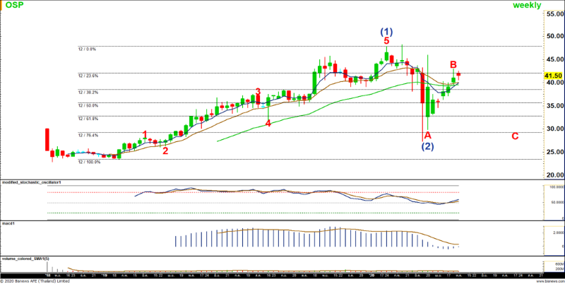 OSP : มองได้ 2 แบบ โดยแบบแรก ปรับลงเป็นคลื่น ABC หลังปรับขึ้นมาครบ 5 คลื่นก่อนหน้านี้ และปัจจุบัน จะลงมาเป็นคลื่น C ซึ่งหากต่ำกว่า 31.00 บาท จะเป็นสัญญาณที่ชัดขึ้น หรืออีกแบบ คือ คลื่นที่ขึ้นมา 5 คลื่นก่อนหน้า เป็นแค่คลื่น (1) ใหญ่ และลงเป็นคลื่น (2) ใหญ่ เพื่อรอฟอร์มตัวเป็นคลื่น (3) ใหญ่ต่อไป  โดยหากขึ้นทะลุจุดสูงเดิมที่ 48.25 จะเป็นสัญญาณที่ชัดขึ้น