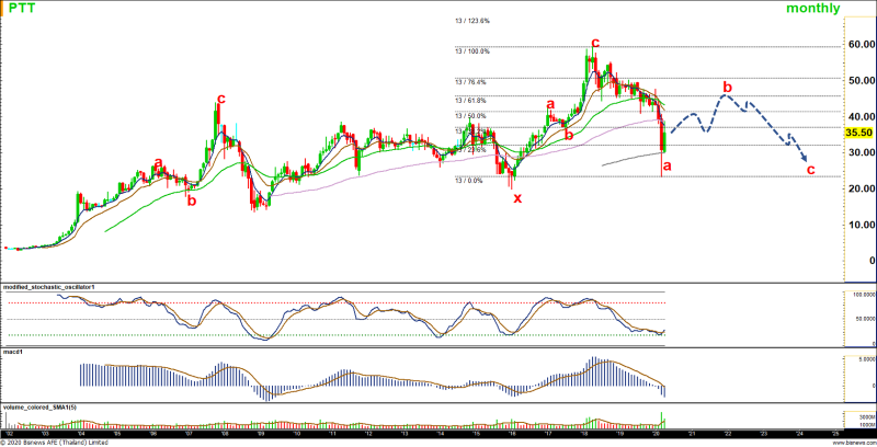 PTT : ภาพรวมขึ้นลงในรูปแบบ Corrective wave 3 คลื่น ABC ทั้งหมด โดยปัจจุบันคาดกำลังขึ้นทำคลื่น b ซึ่งมีกรอบบนจำกัดที่ 45 และ 51 บาท และรอลงทำคลื่น c ต่อ โดยมีเป้าหมายเบื้องต้นที่ 20-23 ทั้งนี้ หากกรณีขึ้นทะลุผ่าน 59.50 บาท ภาพรวมจะกลับมาเป็นบวก หรือคลื่น c ที่รอปรับลง จะไม่เกิดแล้ว