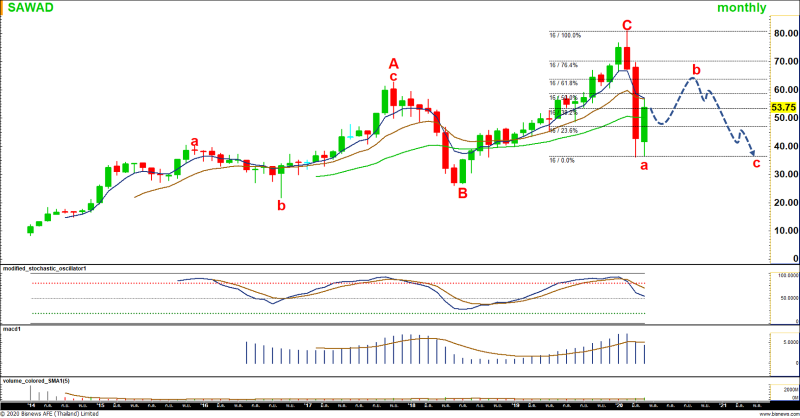 SAWAD : ภาพรวมปรับขึ้นเป็นคลื่น ABC (Zigzag) และปัจจุบันปรับลงเป็นคลื่น abc โดยระยะถัดไปจะขึ้นเป็นคลื่น b โดยมีเป้าหมายที่ 64 และ 70 บาท หลังจากนั้นในระยะยาวถัดไป จะปรับลงเป็นคลื่น c ซึ่งมีโอกาสจะหลุดต่ำกว่า 40 บาท ทั้งนี้ หากขึ้นทะลุจุดสูงเดิมที่ 81 บาท จะเป็นสัญญาณที่ดีต่อการไต่ระดับถัดไป หรือการปรับลงทำคลื่น c ที่มองจะไม่เกิดขึ้น