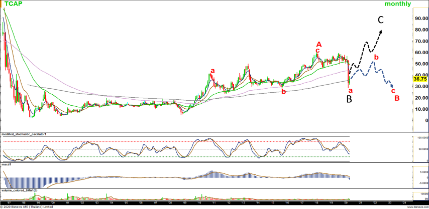 TCAP : กำลังทำคลื่น B โดยปัจจุบันจะปรับตัวขึ้นเป็นคลื่น b ของ B โดยมีแนวเป้าหมายที่ 48.50 และ 53.00 บาท หลังจากนั้นระยะถัดไป จะกลับมาลงทำคลื่น c ของ B บริเวณต่ำกว่า 30 บาท ทั้งนี้ หากกรณีขึ้นทะลุผ่านจุดสูงเดิมบริเวณ 60.25 บาท ภาพรวมจะกลับมาเป็นบวก หรือคลื่น B จบแล้ว สำหรับการทำจุดต่ำรอบก่อน และขึ้นทำคลื่น C ในระยะถัดไป โดยมีแนวเป้าหมายที่ 70.50 และ 83.50 บาท ตามลำดับ (นับแบบสีดำ)