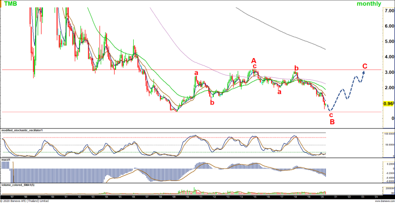 อ่านคลื่นหุ้นรายตัว TMB May 17, 2020 Ong TMB : ภาพรวมเคลื่อนไหว sideways ในรูปแบบ Common Flat ABC โดยปัจจุบันใกล้จบขา B ซึ่งมีเป้าบริเวณกรอบล่างที่ 0.43 บาท หากไม่ต่ำกว่า จะปรับขึ้นมาเป็นคลื่น C และมีเป้าหมายบริเวณกรอบบนที่ 3.00 บาท