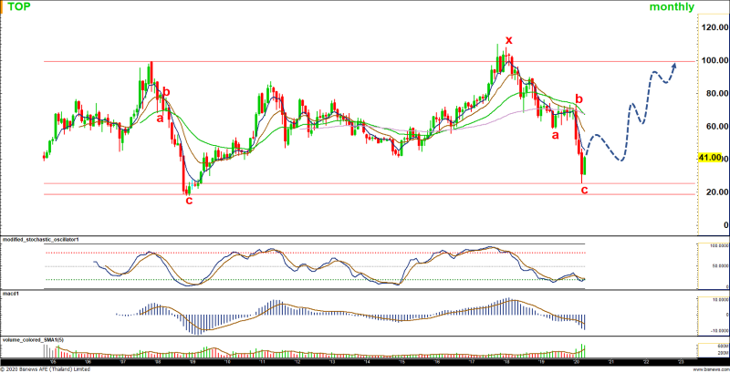 TOP : ภาพรวมเคลื่อนไหว sideways ในรูปแบบ Combination โดยปัจจุบันคลื่น abc ชุดที่สองน่าจะลงครบแล้วโดยทำจุดต่ำบริเวณกรอบล่าง 25.00 บาท และกำลังฟอร์มตัวการปรับขึ้น เพื่อหากรอบบนอีกครั้งบริเวณ 100 บาท ทั้งนี้ หากต่ำกว่า 25.00 บาท จะเป็นสัญญาณลบในภาพรวม