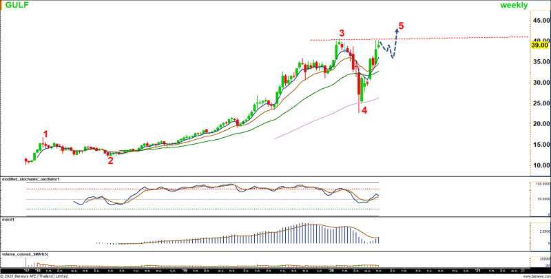 GULF : ลงมาเป็นคลื่น 4 ใหญ่ บริเวณแนวรับ 26.50 บาท เพื่อฟอร์มตัวขึ้นเป็นคลื่น 5 ใหญ่ต่อไป (ไม่ควรต่ำกว่า 26.50 บาท แล้ว) โดยมีเป้าหมายบริเวณ 41 และ 46 บาท
